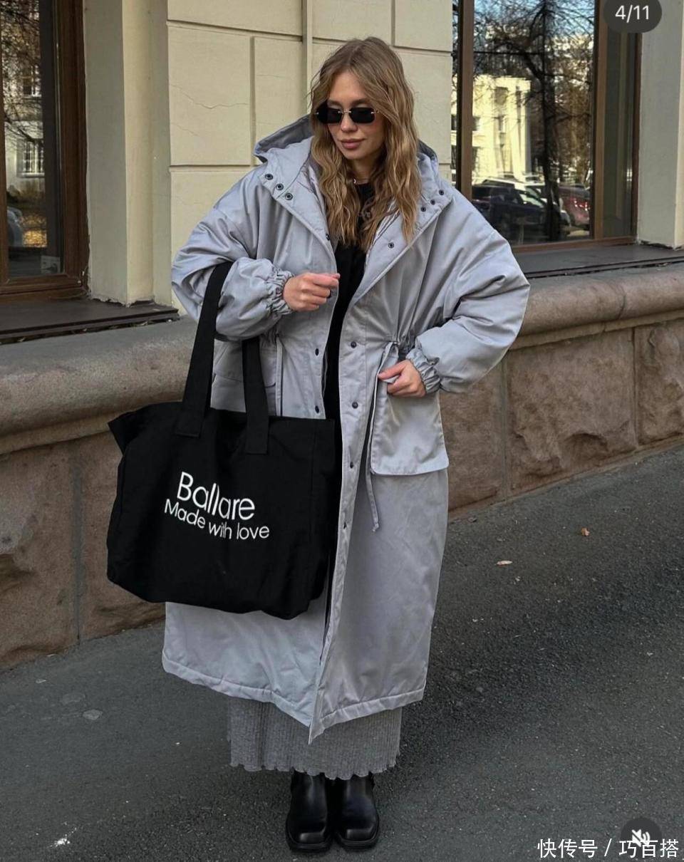 羽绒服上身形似大衣+裙装的叠搭效果,简单耐看,春秋天爱这么穿的姐妹冬天换成长羽绒+半身裙,照样可以继续美。