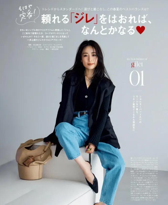 例如下面用一件黑色的无袖背心内搭黑色针织衫,下半身是蓝色的牛仔9分裤,脚上穿着浅口的尖头单鞋,这样的搭配就显得通勤时髦。