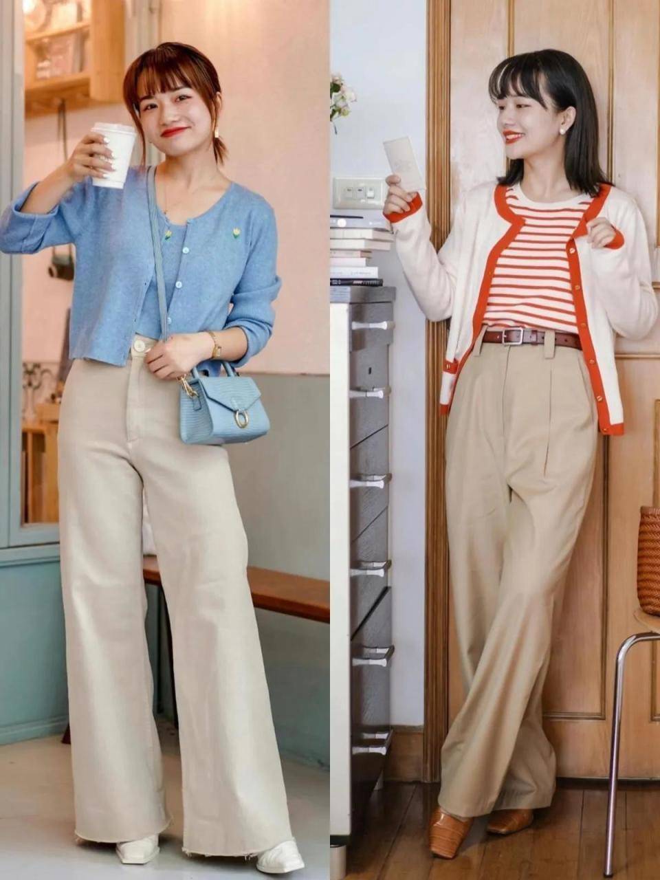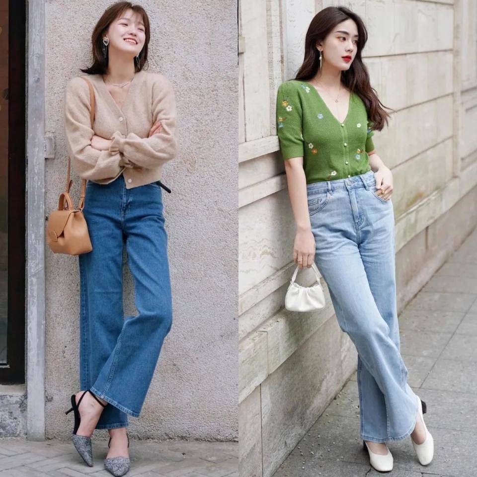 如果,想让自己的穿衣打扮变得更加温柔得体的情况下,我们还可以选择针织开衫来搭配,例如下面这两位达人就是选择了针织开衫来搭配上牛仔直筒裤脚上穿的一双粗跟的浅口单鞋和高跟鞋,这样的打扮更符合咱们普通大众,而且采用的是上短下长的搭配方式,能很好的修饰身材比例,让你的身材形成一个三七分,变得更加协调。