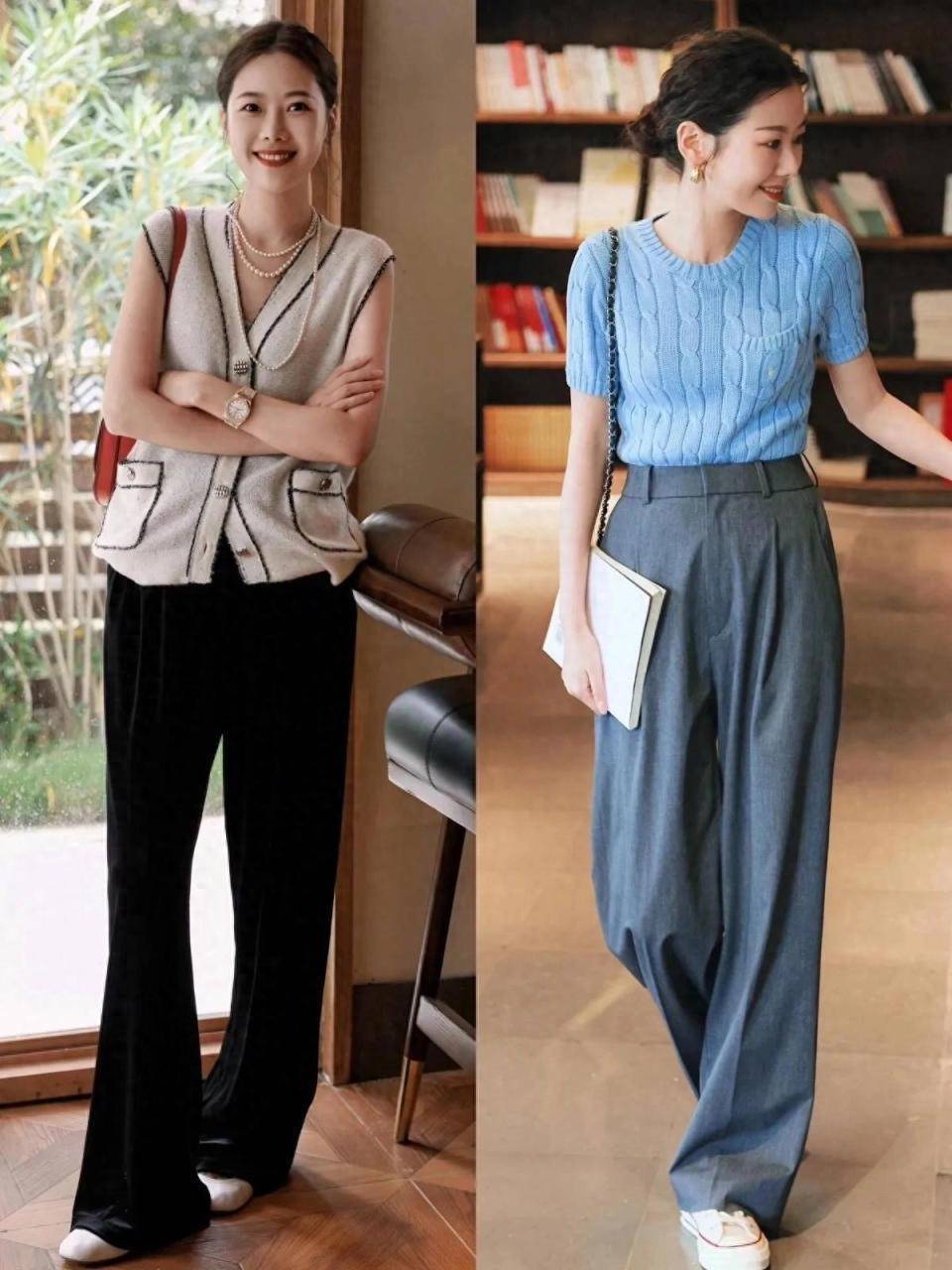 例如,下面用一件浅蓝色的针织短袖上衣搭配上灰色的西装直筒裤,脚上穿了一双白色的帆布鞋,这样的搭配就能使得穿搭者显高显瘦。